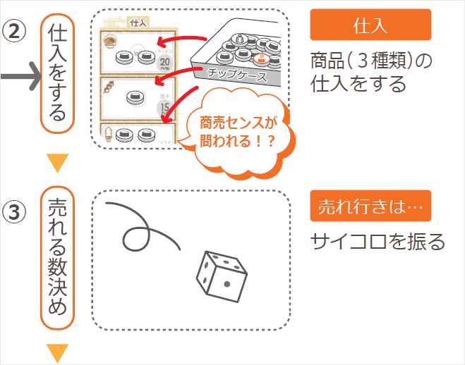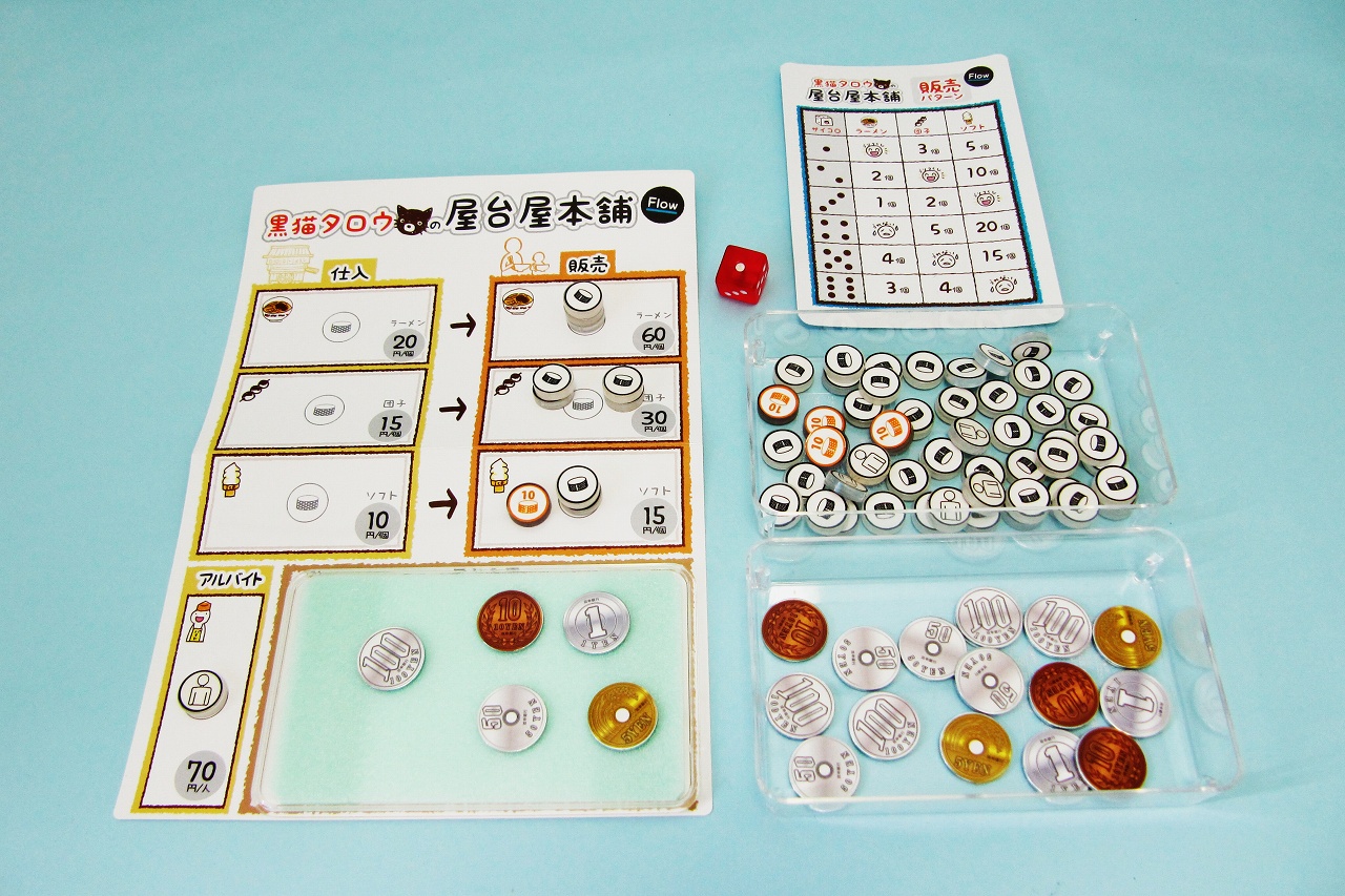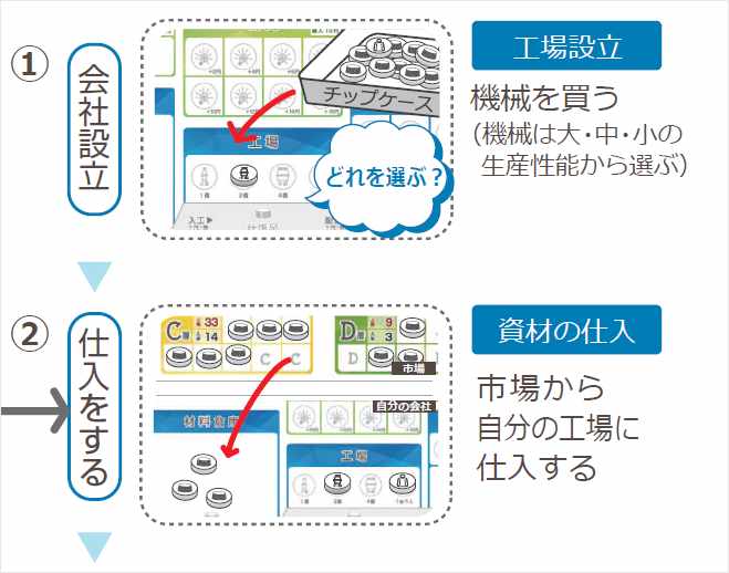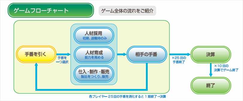 プレイヤーには、持ち時間(手番)があり、経営者として意思決定を積み重ねて、経営を行っていきます。手番を積み重ね、決算を行う1セットが約30分。最大10セットまで連続で経営を行えます。決算はB/S式の簡易決算で、必要に応じて内容を記録すれば、P/Lもも取得可能です。決算では利益計算、税金計算も行い、在庫・総資産・自己資本・他人資本・減価償却・税等基本的な財務感覚を身に着けることができます。ペアとなるプレイヤー同士で市場開拓を行い、仕入・製造・販売の循環でボトルネックを見つけ、利益が出るように改善していく事や、付加価値を高める戦略をとることができる経営シミュレーションゲームです。